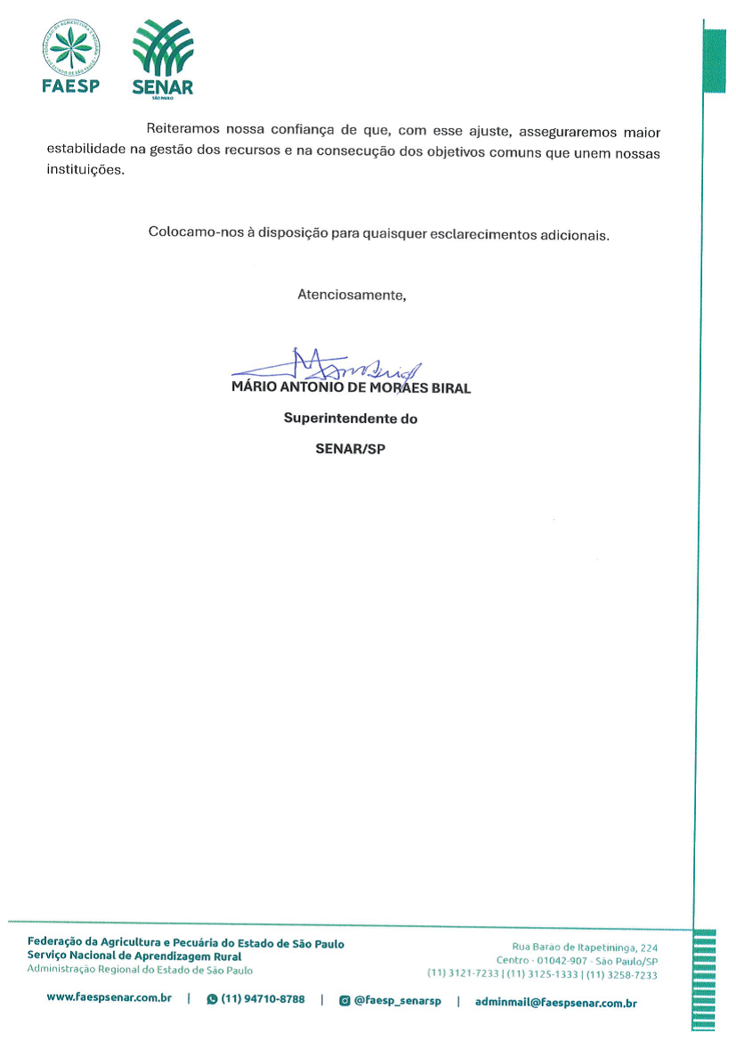 “Não podemos atender ao pedido, pois fomos sumariamente excluídos por questões políticas e tivemos que desmobilizar a estrutura de cursos que contava com instrutores experientes e competentes. Profissionais nos procuram em nossos sindicatos onde temos que explicar, com constrangimento, que a Faesp/Senar através do seu presidente sub judice por revanchismo nos excluiu do rateio das vagas do Senar”.