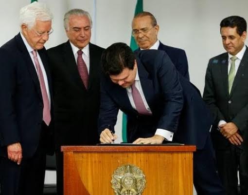 O então ministro de Minas e Emergia, Fernando Coelho Filho, assina ao lado do presidente Michel Temer, o projeto de lançamento do Renovabio que representa o marco regulatório dos biocombustíveis no Brasil