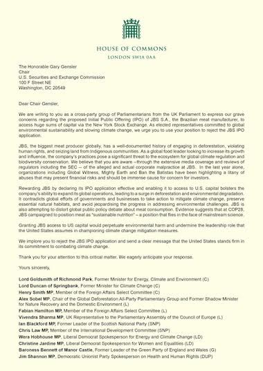 “Além de prejudicar as pessoas que vivem e cuidam das florestas, (a JBS) está contribuindo para um colapso na biodiversidade e causando considerável dano ao planeta que compartilhamos. Seus negócios, portanto, são de interesse de todos, razão pela qual eu e vários parlamentares de diferentes partidos políticos escrevemos uma carta instando a SEC a negar o pedido de IPO da JBS”, afirmou o membro da Casa dos Lordes. Conhecido como Lorde Goldsmith de Richmond Park, o político faz parte do Partido Conservador e é próximo à família real.