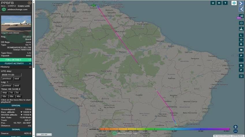 Conforme o site ADSB Exchange, que monitora dados de rastreamento de voos, a aeronave Bombardier Global 7500, partiu de São Paulo à meia-noite do domingo (23) e chegou em Caracas pela manhã.