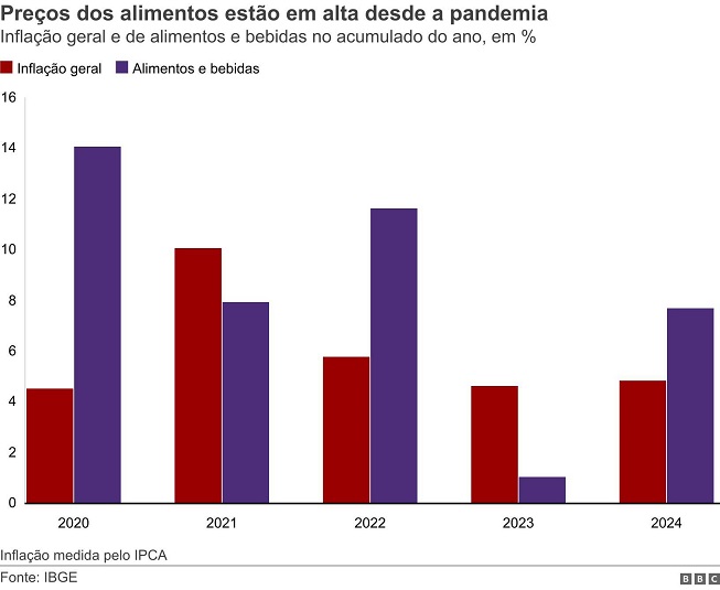 "É provável que os alimentos subam [em 2025], mas quem sabe menos do que no ano passado, algo em torno de 5% a 6%. Já seria uma alta expressiva, mas abaixo do que foi em 2024", prevê o economista.