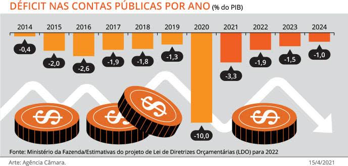 A LDO prevê um déficit de R$ 170,474 bilhões nas contas públicas em 2022, o equivalente a 1,9% do PIB. O déficit é menor do que o de 2020, estimado em 10% do PIB, por causa dos efeitos da crise provocada pela pandemia de coronavírus; e de 2021, previsto em 3,3% do PIB. Em 2020, o governo destinou R$ 632,7 bilhões para o enfrentamento da Covid-19. Alguns gastos passaram para execução em 2021.