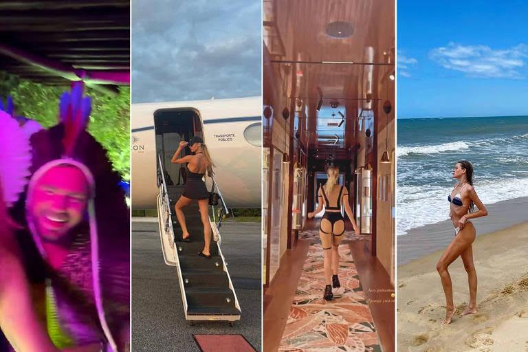 Montagem mostra Daniel Vorcaro durante festa em Trancoso, na Bahia, em outubro de 2022; modelos estrangeiras passaram por São Paulo e Rio de Janeiro, onde se hospedaram em endereços luxuosos e usaram jatinhos Foto reprodução UOL