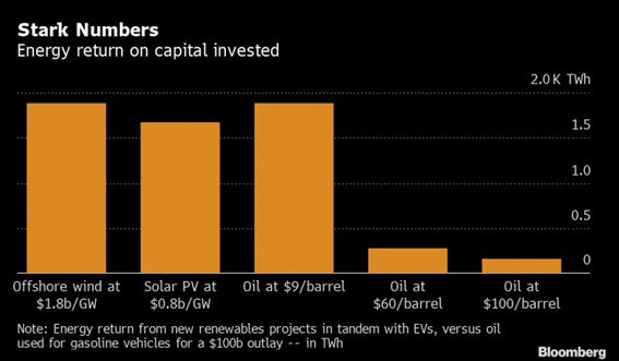 “Nossa análise leva a uma conclusão muito clara para o setor de petróleo: para o mesmo investimento hoje, a energia eólica e solar já produzirá eletricidade muito mais útil para os veículos elétricos do que o petróleo comprado no mercado à vista”, disse Lewis. “São números impressionantes” e sugerem que o modelo econômico das energias renováveis, em conjunto com os veículos elétricos, deve se tornar “irresistível na próxima década”.