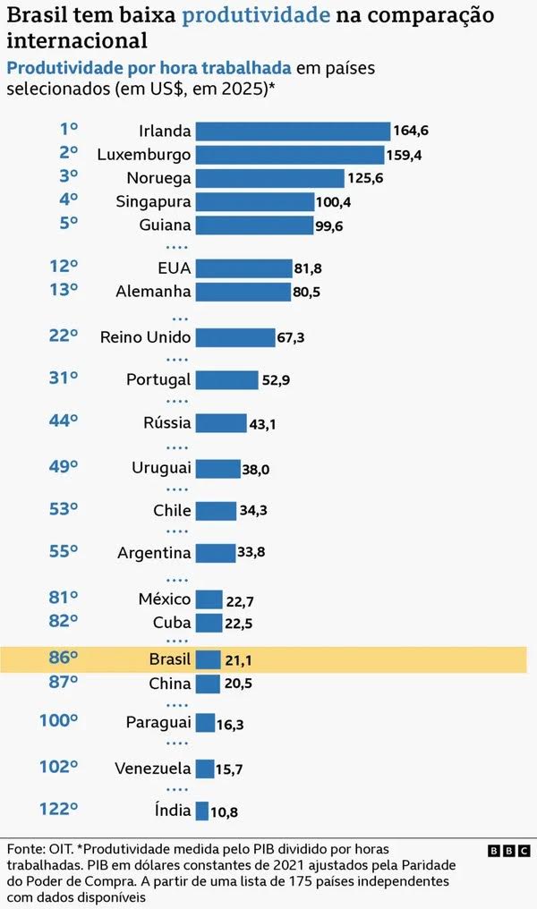 Segundo dados da OIT para 175 países, o Brasil ocupa apenas a 86ª posição entre as nações mais produtivas do mundo, considerando a produtividade por hora trabalhada, logo à frente da China (87ª).