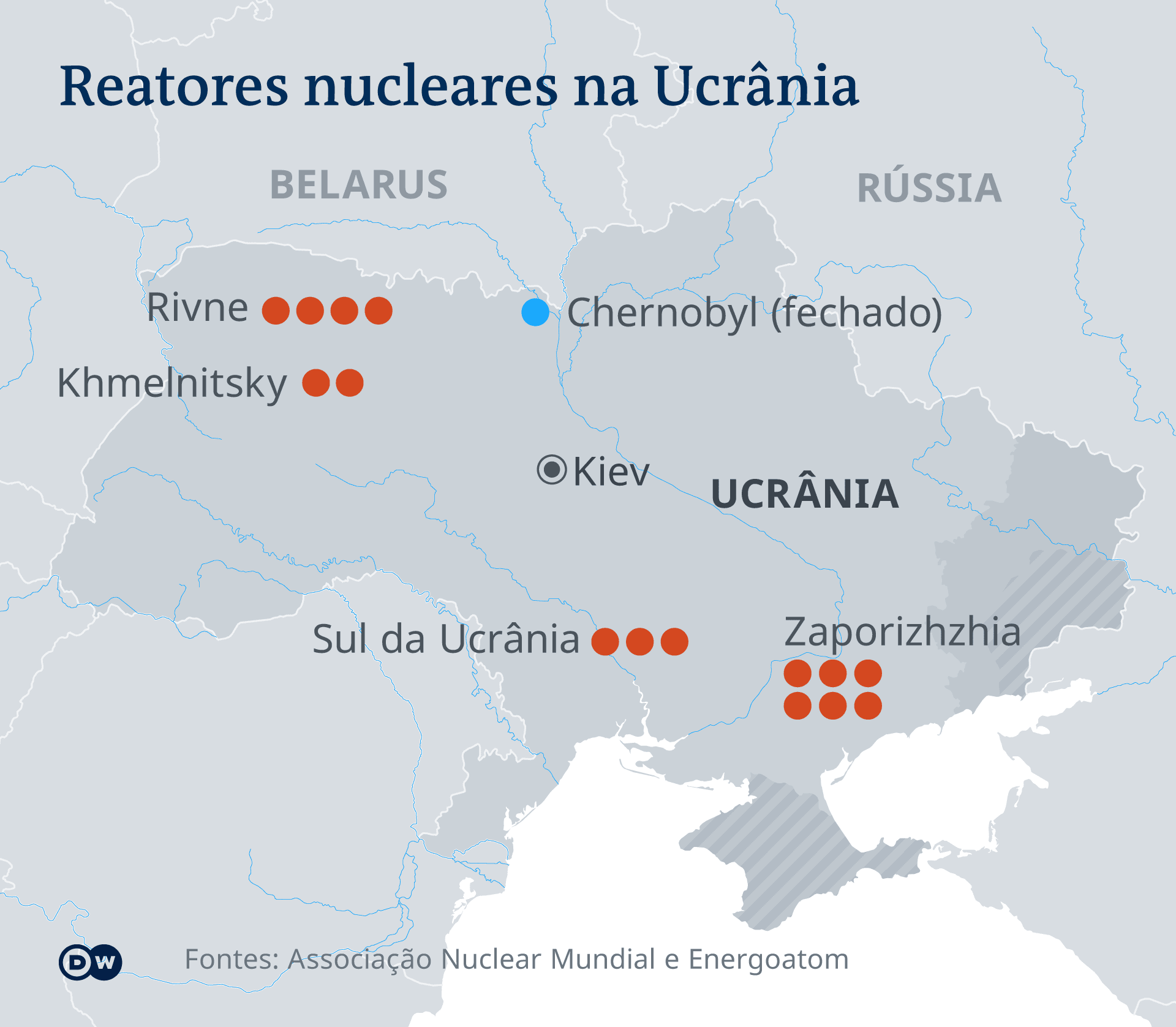 "É uma situação única na história da energia nuclear – na verdade, na história – em que uma nação que opera 15 reatores nucleares está no meio de uma guerra de grande escala", afirma Shaun Burnie, especialista em energia nuclear do Greenpeace na Ásia Oriental, em entrevista à DW. Essas usinas fornecem cerca de metade da eletricidade da Ucrânia, embora neste momento apenas nove dos 15 reatores estejam operando, diz Burnie.